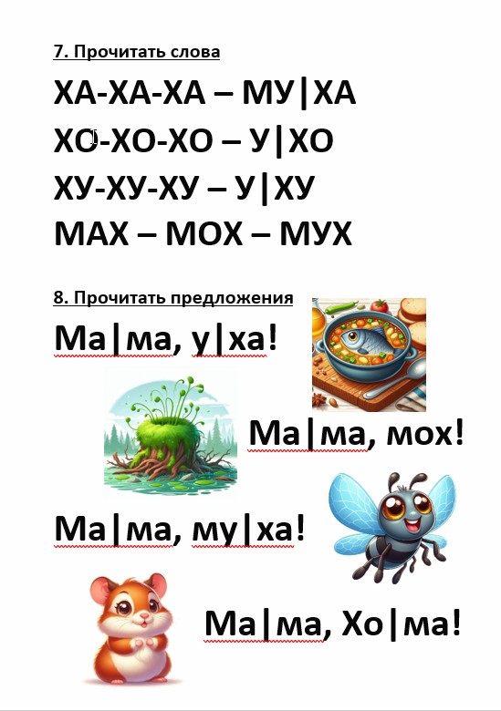 | Чтение слов | Короткие слова (МАМА, МУХА, СОВА). |